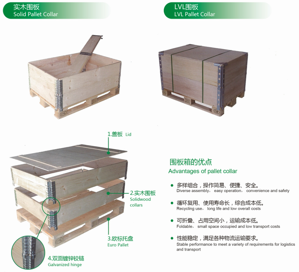 围板箱又名托盘围板(Pallet Collar) , 是一种可复用、可折叠的包装容器。围板箱一般包括托盘、箱体、箱盖三个组成部分,可根据产品高度需要,通过调整围板数量来调整箱体高度。